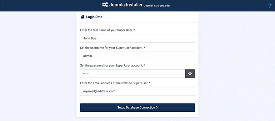 On this screen, you should enter Joomla super user's login data. Enter the real name of your superuser account (your name), then username, password, and email address. Finally, click the Setup Database Connection button to proceed.