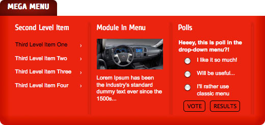 This menu system allows you to show first, second and third menu levels at once and to show Joomla modules in drop-down panes.