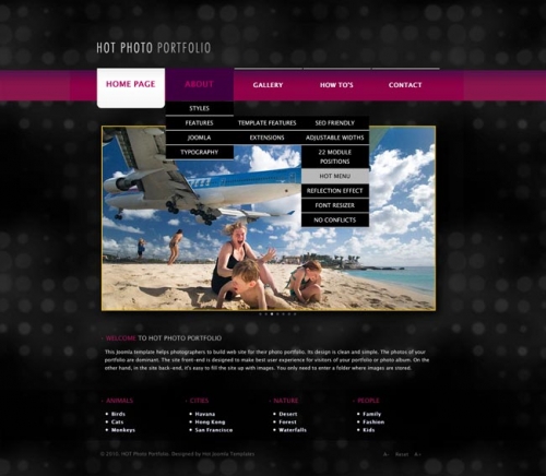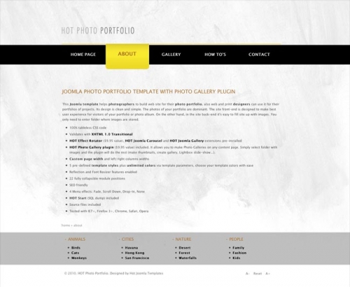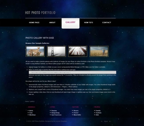 Photo Portfolio template is a responsive Joomla template that can help photographers and designers to build their portfolio websites. It's based on clean and simple design. The photos of the artist's portfolio are dominant. The site front-end is designed to bring the best user experience for visitors of the portfolio or photo album pages. On the other hand, in the site back-end, it's easy to fill the site up with images. You only need to enter a folder where your images are stored.