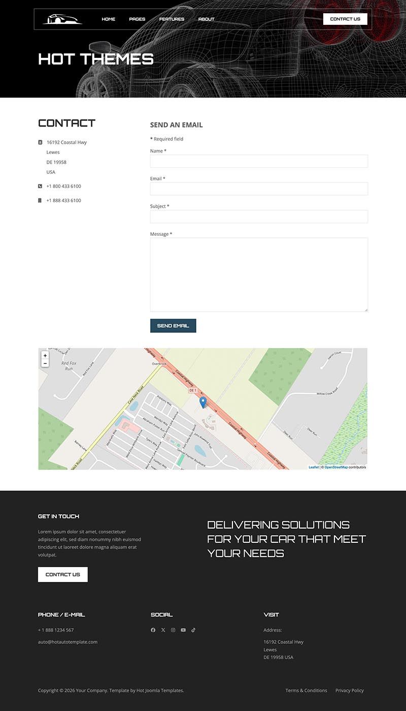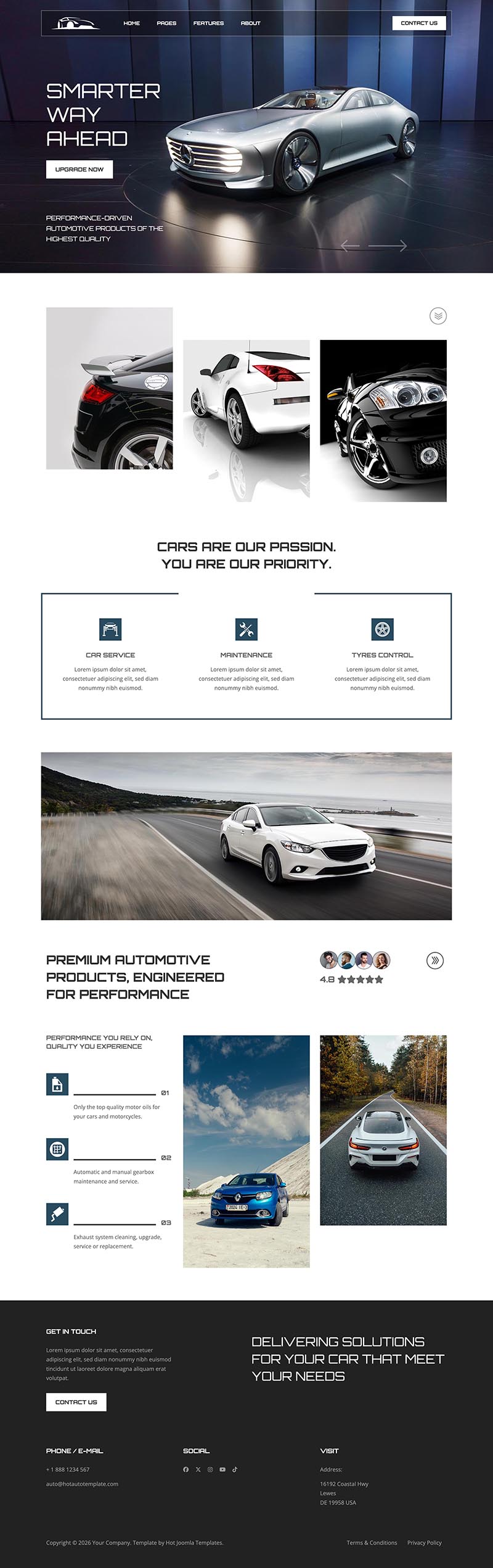 The content pages of the Auto template demo are created with Sparky - Joomla Page Builder, a built-in Joomla page builder that simplifies creating custom pages and adding or editing content.