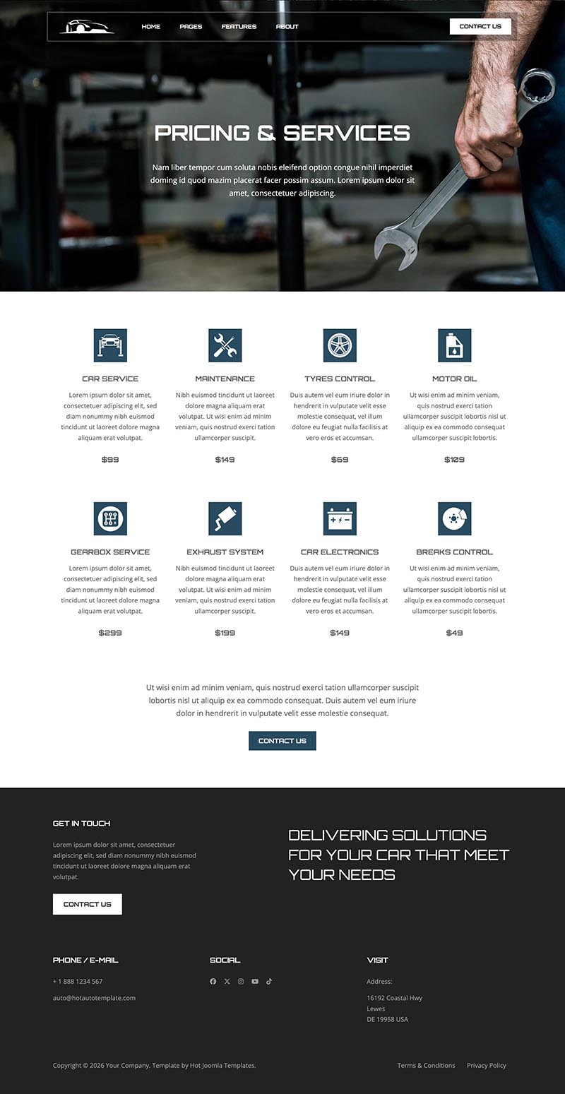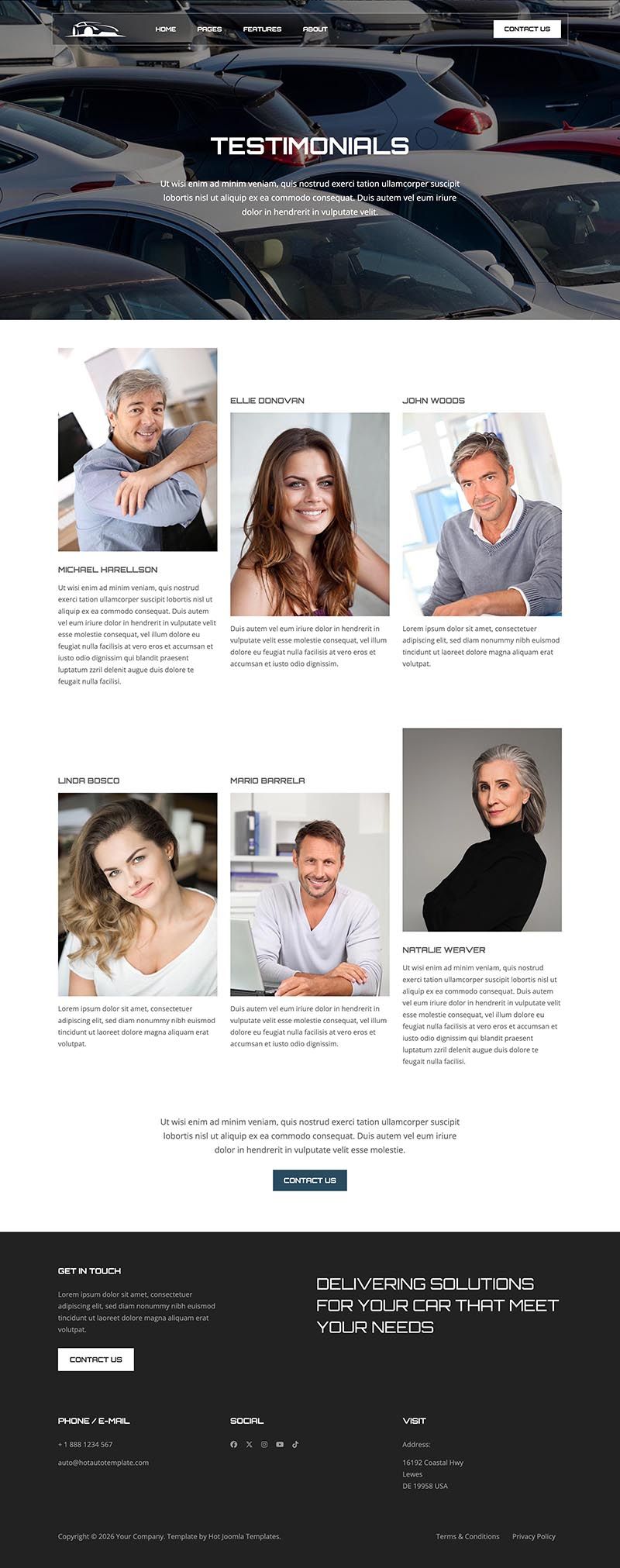 The customized version of the Carousel module, designed specially for this template, dominates on the home page. The top part of the home page contains images of modern cars. Some of them are in the carousel, and others are in the content area. The content can be edited easily using the integrated page builder. The most important automotive services are also described on the home page. The design is enriched with some appropriate icons. Also, a block that leads to the full testimonials page is included on the home page.