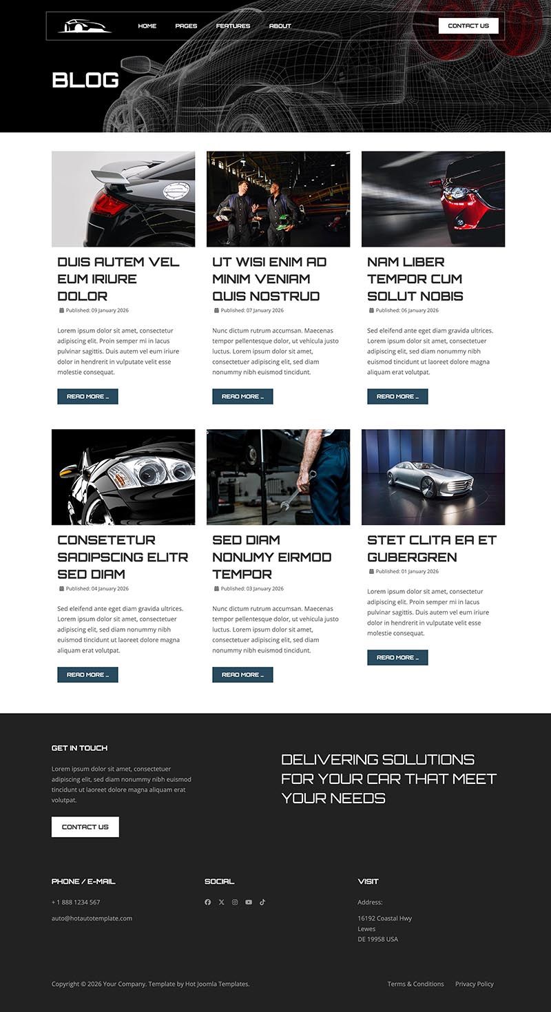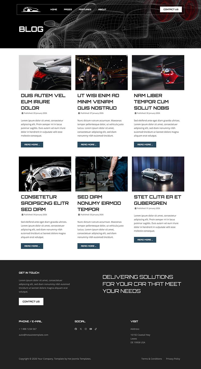 The inner pages of the Hot Auto Joomla template are designed according to the overall website look and included in the template package. Using the page builder, you can quickly update the demo pages and have your own page to show your company team, or the full list of pricing and services. Also, there's a dedicated page for the testimonials and more. The company blog page, where you can publish news related to the automotive industry and about your services, is included. The Auto Joomla template contains all the modules that you can see on the template demo. It's not just a template. It's a turn-key solution for your new website about cars and related services.