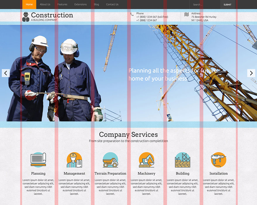 A sample of vertical (red) and horizontal cell spacing (blue). Default values can be overridden in custom CSS for certain rows. This is a sample from the Construction template. This template is available for all premium members.