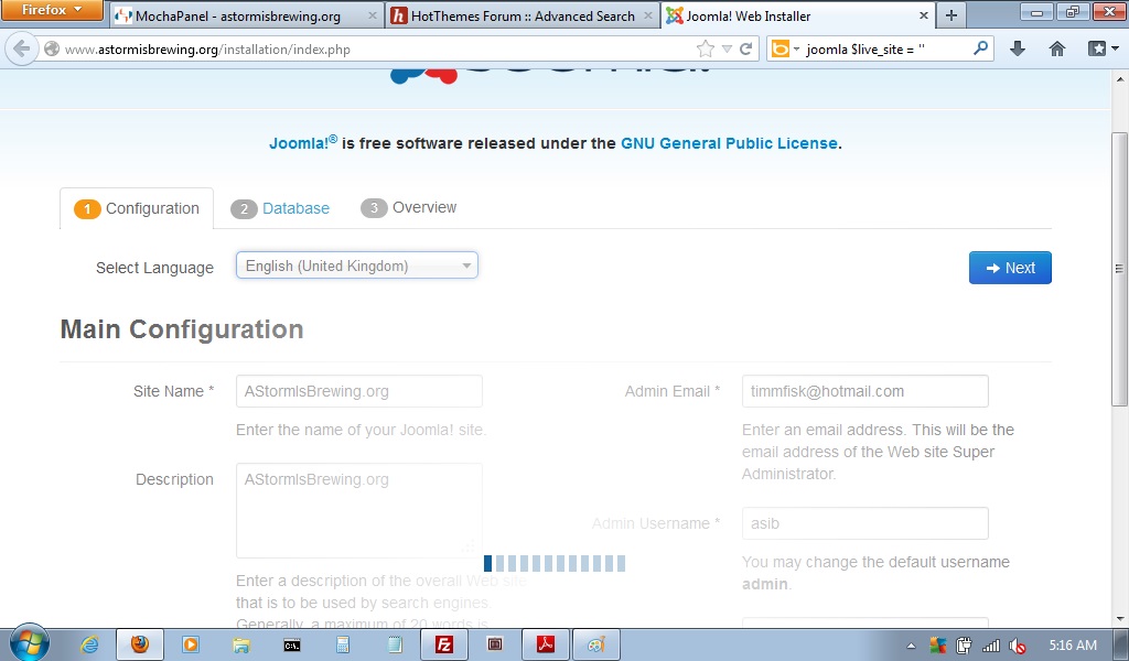 I then point the browser to the domain, enter the required information for the Configuration Tab and the application hangs. I am not able to advance to the Database portion of the install.