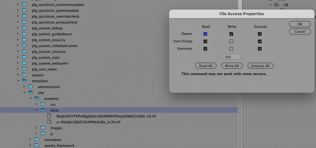 If you can't fix the folder issue, try adding this to the top of the /media/templates/site/academy/css/custom.css file to use the Alfa Slab One font hosted on Google's server: