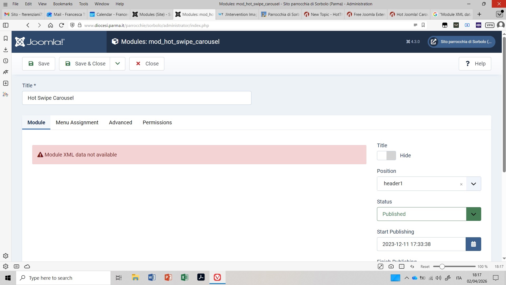 on my site ( www.diocesi.parma.it/parrocchie/sorbolo/ ), where I have the Hot Startup template installed, I have a problem (since today or maybe a few days ago) with most of the site's Hot modules (for example Hot maps, Hot swipe carousel, and so on...): they are not working on the site and, when I try to enter into the module settings, I get: Module XML data not available (see screenshot attached).